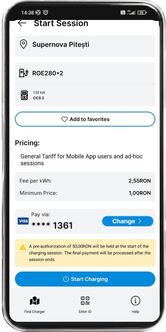 10. Review the pricing information and the selected payment method and click Start Charging